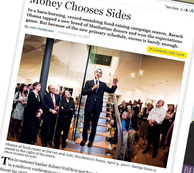 In the New York Magazine, “Money Chooses Sides,” note the composition of the photograph that accompanies it. I do not think it is accidental. I do not know if the photographer (or even Obama himself) intended the tableau, but of all the pictures doubtless taken of the event, this was the one selected by the magazine’s editors to illustrate Obama’s influence. Their motive may have been mockery of the guests or unintended adulation of Obama. That is irrelevant. The picture captures the essence of Obama’s appeal.